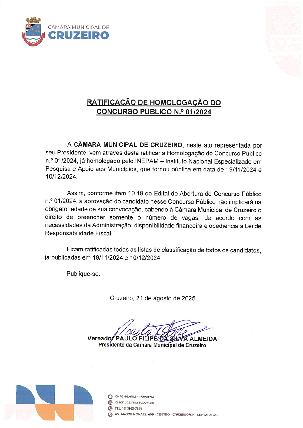 A Câmara Municipal de Cruzeiro, por meio de seu Presidente, torna público que foi ratificada a Homologação do Concurso Público n.º 01/2024, realizado pelo INEPAM – Instituto Nacional Especializado em Pesquisa e Apoio aos Municípios.