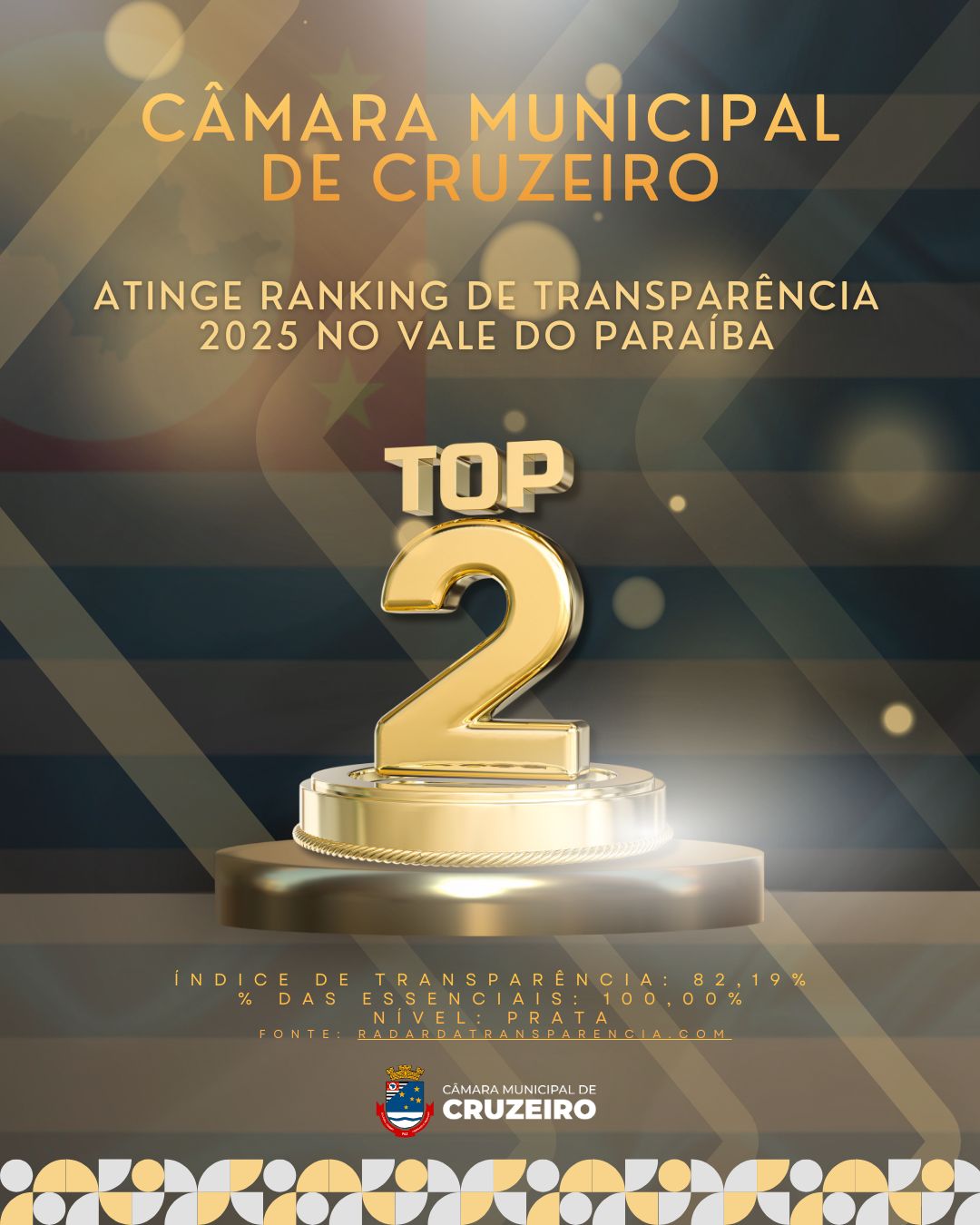 A Câmara Municipal de Cruzeiro alcançou um marco importante em sua trajetória institucional ao registrar um avanço histórico nos indicadores de transparência pública. Segundo os dados consolidados do Radar da Transparência Pública 2025, o Legislativo cruzeirense conquistou o Selo Prata de Transparência, atingindo 82,19% no índice geral e 100% dos critérios essenciais, garantindo ainda o 2º lugar no ranking do Vale do Paraíba.